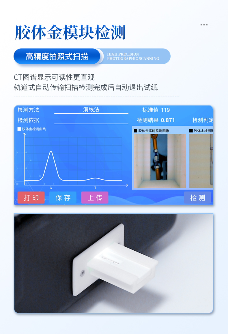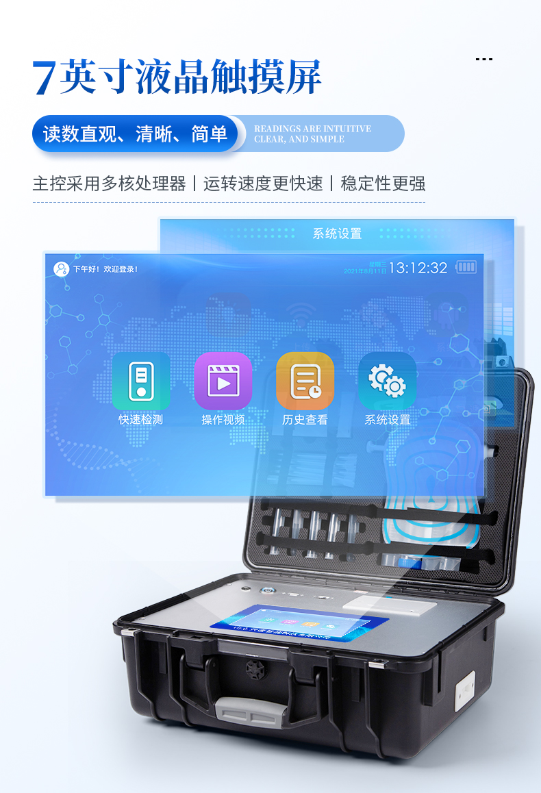 | 儀器采用手提式一體化系統檢測技術,將分光光度模塊、新型農殘檢測模塊、數字化管理模塊、無線通訊模塊高度集成于一體,支持檢測200種食品安全檢測項目,同時預留升級檢測方法。 | 儀器檢測模塊標準化、智能化,檢測項目可隨意自由組合。檢測箱體內置多個標準檢測單元,檢測模塊可以調整配置。 | 顯示屏幕:儀器采用10.1英寸豎向液晶觸摸屏顯,搭配運行安卓智能操作系統,主控芯片采用ARM Cortex-A7,RK3288/4核處理器,主頻1.88Ghz,操作方便,性能更強。 | 檢測通道:≥12通道;采用精密旋轉比色池設計,使用同芯片同光源校準精度,解決不同光源之間的誤差值,更加準確**。(1-12通道間誤差0.1%,***:**202022821055.2) | 儀器光源:高精度進口四波長冷光源,每個通道均配置 410、520、590、630nm 波長光源,標配**的光路切換裝置,專利光路切換功能可實現64波長,并且所有檢測項目可實現所有通道同時檢測。 | 設備可一鍵校準,自動保存校準數據,自動對比校驗,得到精準光源,采用Android SP存儲數據,光源數據永不丟失,方便每一次使用。 | 通訊接口:配備無線通信模塊、4G(APN)通訊模塊、藍牙傳輸,同時具有雙USB接口以及RJ45網線接口,可以多方式實現數據保存及數據傳輸 | 存儲方式:支持U盤存儲,標準USB接口,免驅動安裝。檢測結果存儲容量20萬條以上,可生成Excel表格進行拷貝,并具有登錄保護功能。 | 智能化操作系統: | 1)操作系統:儀器可在同一檢測界面自動對應相關檢測通道,一次性選擇1-12個樣品名稱,無需退出界面,節省操作時間。并可以對每個通道屬性和樣品信息單獨進行編輯,例如送檢單位、人員,檢測人員等,打印時勾選打印顯示。 | 2)數據集成系統:設備首頁自動匯總分析檢測數據,包含:周檢測數據、月檢測數據,全部檢測總數量,均包含檢測總數,合格數,不合格數,以及相關柱形分析圖,各項檢測數據一目了然,無需電腦查詢,更加快捷直觀。 | 3)數據庫系統:十幾項數據庫分類管理儀器:包含項目類型、項目數據、檢測數據、歷史記錄、國標信息、曲線信息、采樣信息、檢測信息、受檢信息、復核信息、圖表信息、光源校準信息、打印樣式信息、樣品庫信息等等,數據庫之間互相協調聯動保證數據的真實完整性。同時產品數據庫以及歷史檢測記錄支持一鍵檢索功能。 | 4)限量規判系統:具有限量查詢、添加物質合規判定系統。檢測出結果后,系統自動調用系統數據庫中相關國標進行比對判定,客觀顯示判定結果是否合格。 | 5)項目預設系統:儀器具有任務預設模塊,一鍵提前預設,給出方便快捷的新檢測方案,每一個任務分別可以設置不同的樣品、批次、編號、來源、備注、抽樣信息、檢測信息、受檢信息、復核信息等更多信息。樣品送檢時一鍵調取保存信息,并可多次調取,大大提高檢測效率。 | 6)數據監管系統:同步對接監管平臺,數據可局域網和互聯網數據上傳,檢測結果可選擇直接傳至食品安全監管平臺。進行區域食品安全監管及大數據分析處理與數據統計,檢測區域食品安全長短期動態,達到食品安全問題預估、預警。 | 7)打印系統:內置全新打印機,新創自定義打印方式,可按需靈活勾選控制:產品合格證(國家農業部標準要求),二維碼,抽樣信息、檢測信息,受檢信息、復核信息、抽樣日期、檢測日期等信息的打印。 | 供電模式:儀器交直流兩用,直流12V供電,可連接車載電源,可配6ah大容量充電鋰電池,電量可實時顯示,方便戶外流動測試。 | 膠體金檢測模塊:采用雙通道CMOS成像處理技術及膠體金免疫層析技術,可同時讀取雙膠體金卡數據,自動采集、處理分析,將檢測結果顯示,并可根據參考限值自動判斷檢測結果,可檢測常見的獸藥殘留、生物毒素、抗生素、違禁添加物等。 | 1)探測技術:CMOS成像探測; | 2)檢測通道:1個通道; | 3)檢測方式:消線法和比色法; | 4)顯示模式:陰性或陽性; | 5)曲線形式:軌道式掃描方式,顯示金標卡圖像,實時生成、識別CT曲線圖,無需手動調整,完成檢測后自動退出檢測卡。兼容市場上其他金標卡,使用耗材不受限制。 | 儀器加入遠程升級功能,可定向分客戶分儀器更新,開機后自動更新,客戶無需任何操作,即可升級全新項目。做到了無需退換機器即可實現實時遠程升級檢測儀器。 |